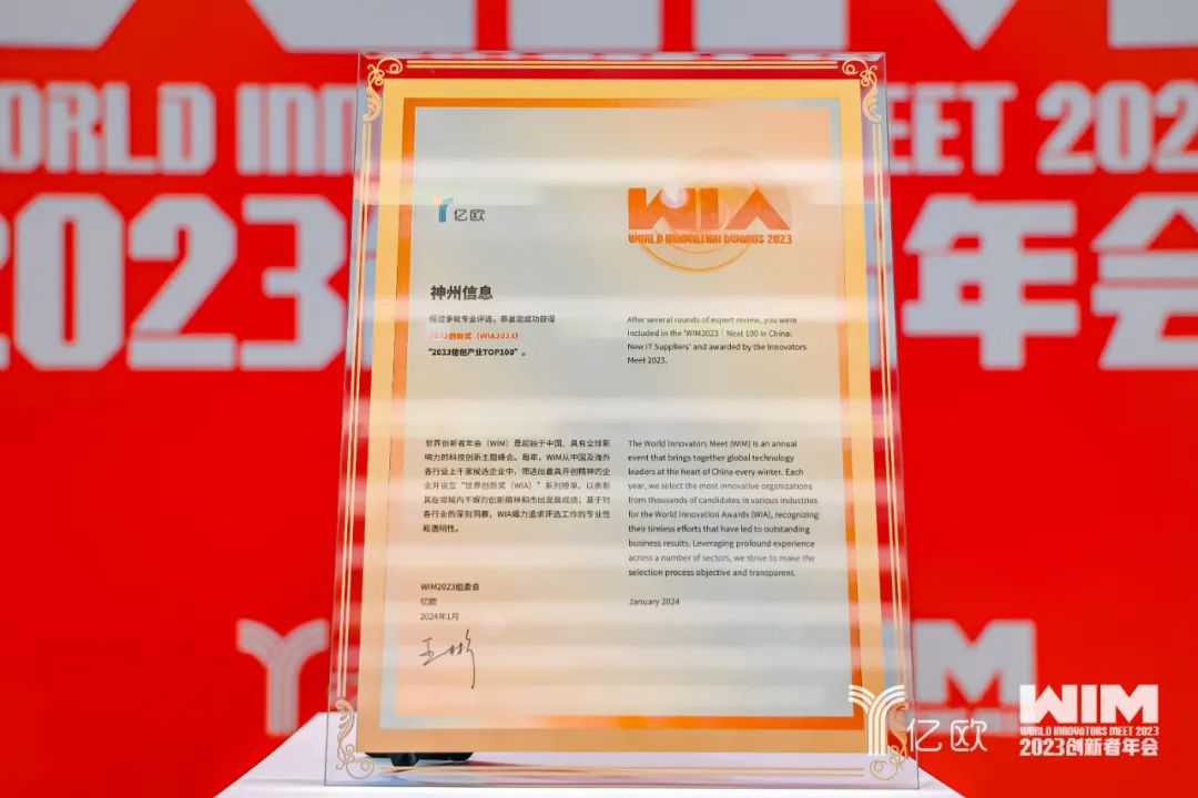 在亿欧网主办的WIM 2023(世界创新者年会)正式公布2023创新奖(WIA2023)的评选结果,神州信息荣获“2023中国金融科技创新企业TOP 30”、“2023信创产业TOP 100”。