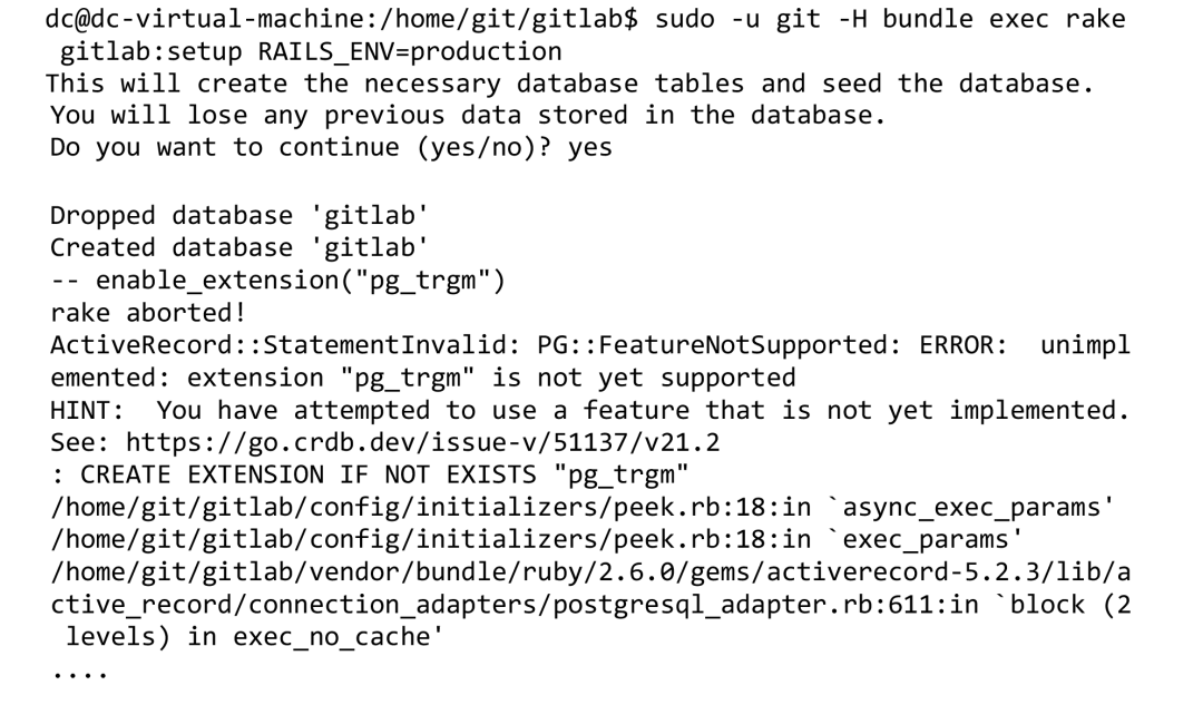再次执行setup创建数据库,发现还是报相同的问题“ActiveRecord::StatementInvalid: PG::FeatureNotSupported: ERROR: unimplemented: extension "pg_trgm" is not yet supported”,说明新版本也无法支持extension特性。